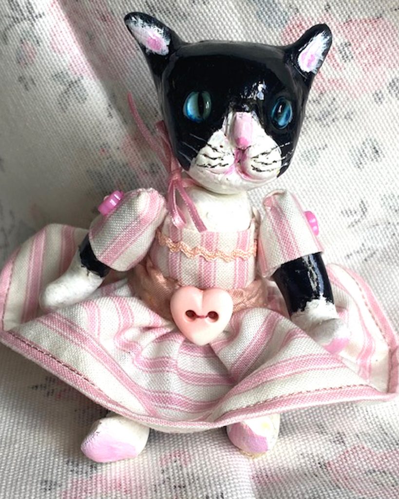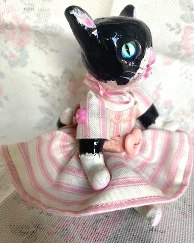CORA; A polymer clay cat doll , 3.5 inches sitting size. She has a painted face and body with glass eyes and she is wearing a cotton dress and knickers. She is button jointed and has a tail at the back. She comes in a box and is £45 including postage and packing , please add £6 for international postage. MORE CAT DOLLS available on request !POLLY; A 4 inch high polymer clay doll with button joints and glass bead eyes. She is wearing a velvet dress with a fancy shimmer woven ribbon bow and embroidered sleeves . She has a gem in her hair and her face is glazed. She comes in a box . £30 plus £8 UK postage , add £5 for International post. SOLD
