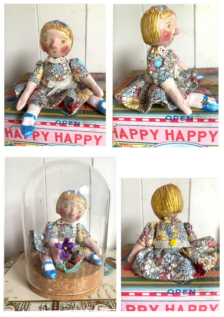 MIA; 3.5 inches high sitting and made of painted air dried clay with a pearlised finish. She is wearing a cotton frock with a shimmery ribbon bow at her waist . She is button jointed with glass bead eyes. She can come either in a glass dome with a cork base and hand made paper violet or just as she is. £35 alone or £40 with the dome . UK postage £6 add £13 for US shipping. SOLDPOLLY; A 4 inch high polymer clay doll with button joints and glass bead eyes. She is wearing a velvet dress with a fancy shimmer woven ribbon bow and embroidered sleeves . She has a gem in her hair and her face is glazed. She comes in a box . £30 plus £8 UK postage , add £5 for International post. SOLD
